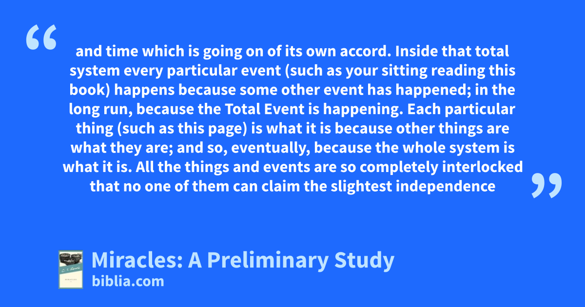 and time which is going on of its own accord. Inside that total system every particular event (such as your sitting reading this book) happens because some other event has happened; in the long run, because the Total Event is happening. Each particular thing (such as this page) is what it is because other things are what they are; and so, eventually, because the whole system is what it is. All the things and events are so completely interlocked that no one of them can claim the slightest independence