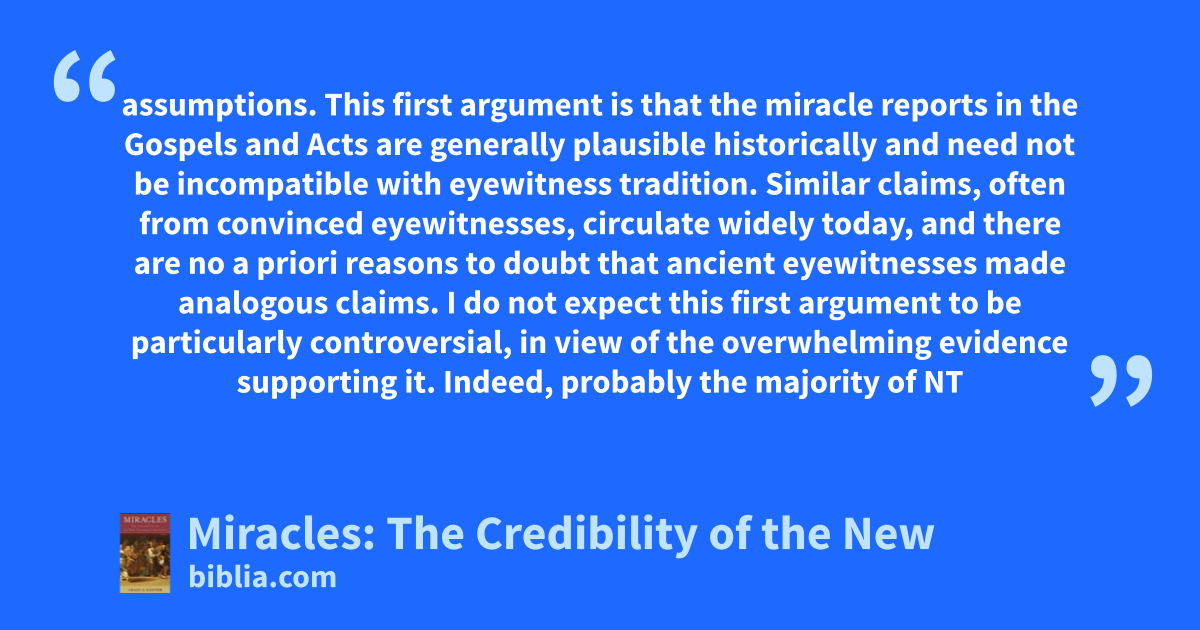 assumptions. This first argument is that the miracle reports in the Gospels and Acts are generally plausible historically and need not be incompatible with eyewitness tradition. Similar claims, often from convinced eyewitnesses, circulate widely today, and there are no a priori reasons to doubt that ancient eyewitnesses made analogous claims. I do not expect this first argument to be particularly controversial, in view of the overwhelming evidence supporting it. Indeed, probably the majority of NT