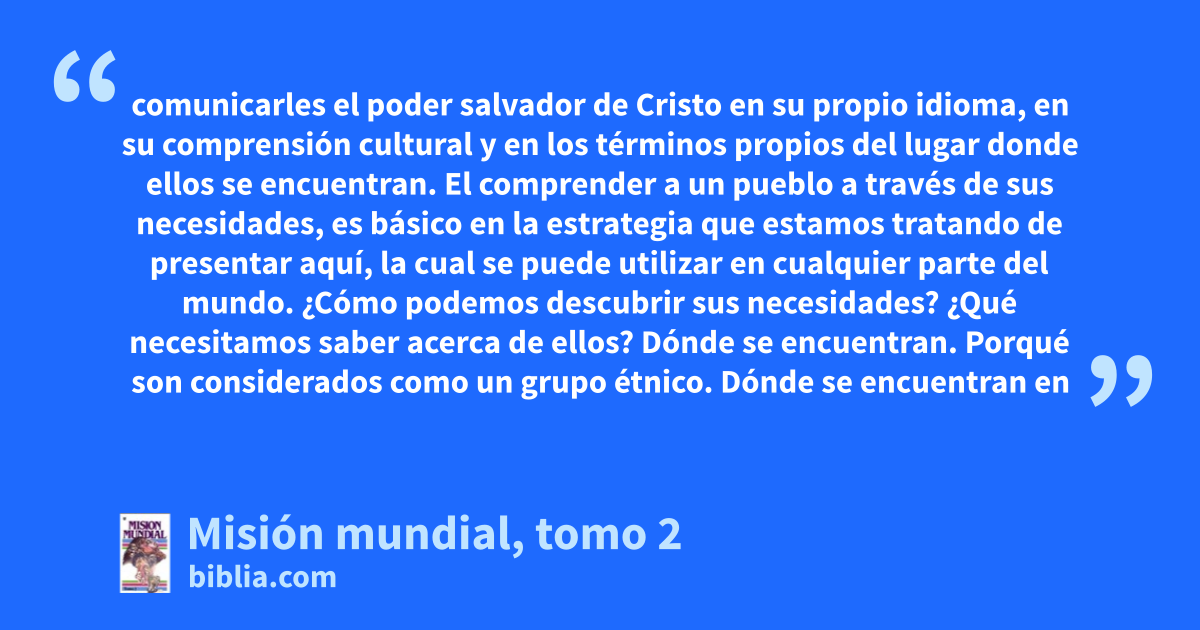 comunicarles el poder salvador de Cristo en su propio idioma, en su comprensión cultural y en los términos propios del lugar donde ellos se encuentran. El comprender a un pueblo a través de sus necesidades, es básico en la estrategia que estamos tratando de presentar aquí, la cual se puede utilizar en cualquier parte del mundo. ¿Cómo podemos descubrir sus necesidades? ¿Qué necesitamos saber acerca de ellos? Dónde se encuentran. Porqué son considerados como un grupo étnico. Dónde se encuentran en