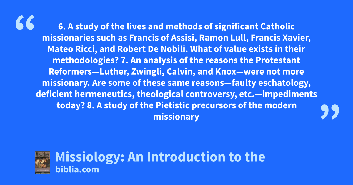 6. A study of the lives and methods of significant Catholic missionaries such as Francis of Assisi, Ramon Lull, Francis Xavier, Mateo Ricci, and Robert De Nobili. What of value exists in their methodologies? 7. An analysis of the reasons the Protestant Reformers—Luther, Zwingli, Calvin, and Knox—were not more missionary. Are some of these same reasons—faulty eschatology, deficient hermeneutics, theological controversy, etc.—impediments today? 8. A study of the Pietistic precursors of the modern missionary