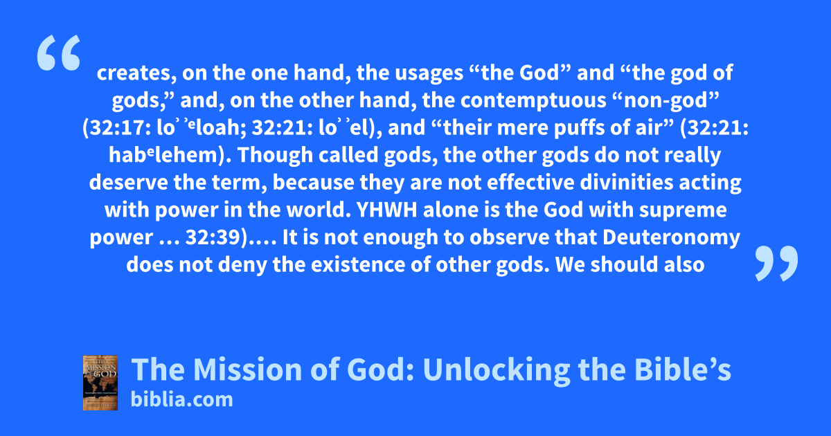 creates, on the one hand, the usages “the God” and “the god of gods,” and, on the other hand, the contemptuous “non-god” (32:17: loʾ ʾᵉloah; 32:21: loʾ ʾel), and “their mere puffs of air” (32:21: habᵉlehem). Though called gods, the other gods do not really deserve the term, because they are not effective divinities acting with power in the world. YHWH alone is the God with supreme power … 32:39).… It is not enough to observe that Deuteronomy does not deny the existence of other gods. We should also