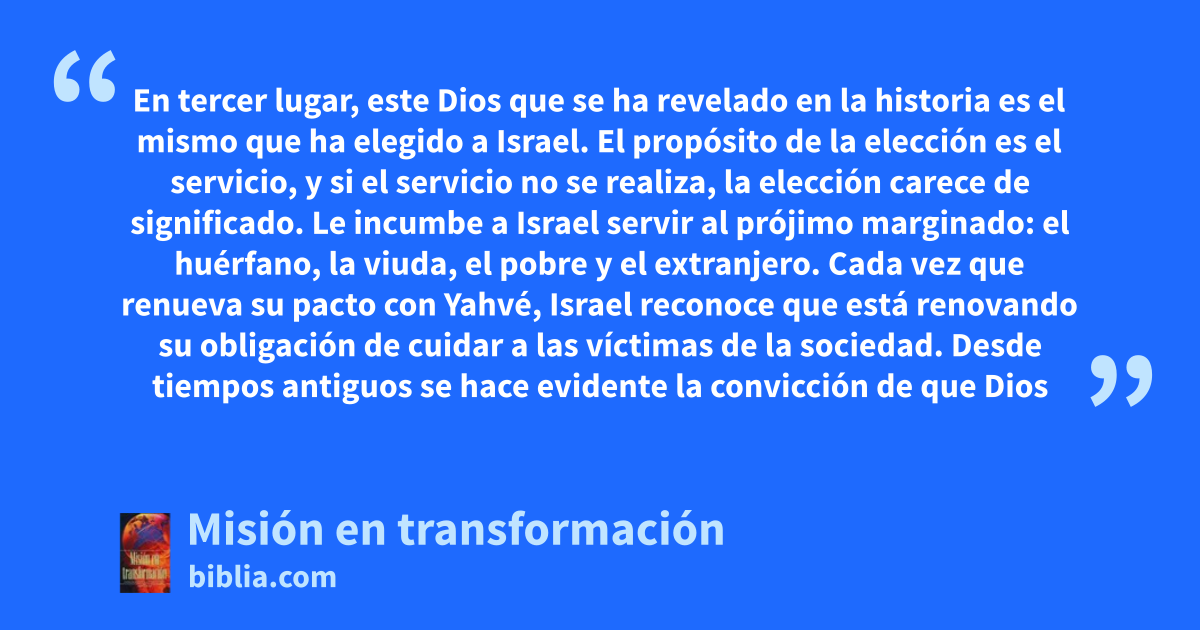 En tercer lugar, este Dios que se ha revelado en la historia es el mismo que ha elegido a Israel. El propósito de la elección es el servicio, y si el servicio no se realiza, la elección carece de significado. Le incumbe a Israel servir al prójimo marginado: el huérfano, la viuda, el pobre y el extranjero. Cada vez que renueva su pacto con Yahvé, Israel reconoce que está renovando su obligación de cuidar a las víctimas de la sociedad. Desde tiempos antiguos se hace evidente la convicción de que Dios