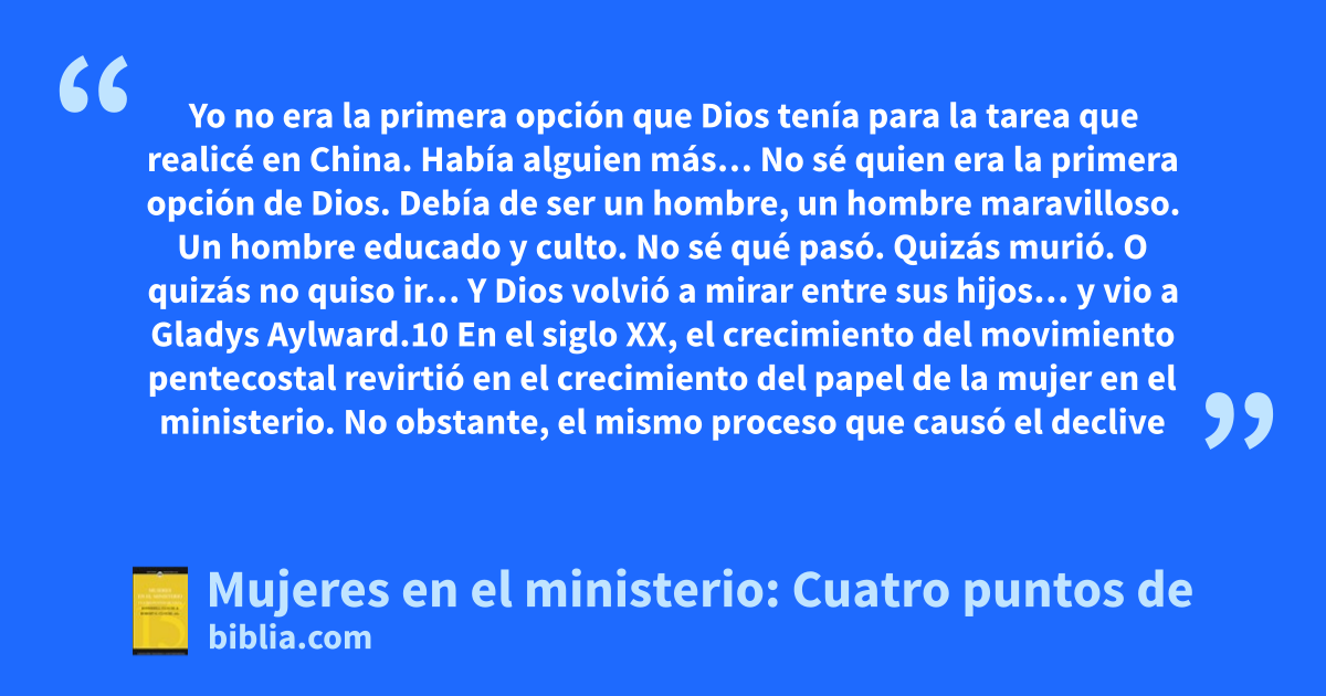 Yo no era la primera opción que Dios tenía para la tarea que realicé en China. Había alguien más… No sé quien era la primera opción de Dios. Debía de ser un hombre, un hombre maravilloso. Un hombre educado y culto. No sé qué pasó. Quizás murió. O quizás no quiso ir… Y Dios volvió a mirar entre sus hijos… y vio a Gladys Aylward.10 En el siglo XX, el crecimiento del movimiento pentecostal revirtió en el crecimiento del papel de la mujer en el ministerio. No obstante, el mismo proceso que causó el declive