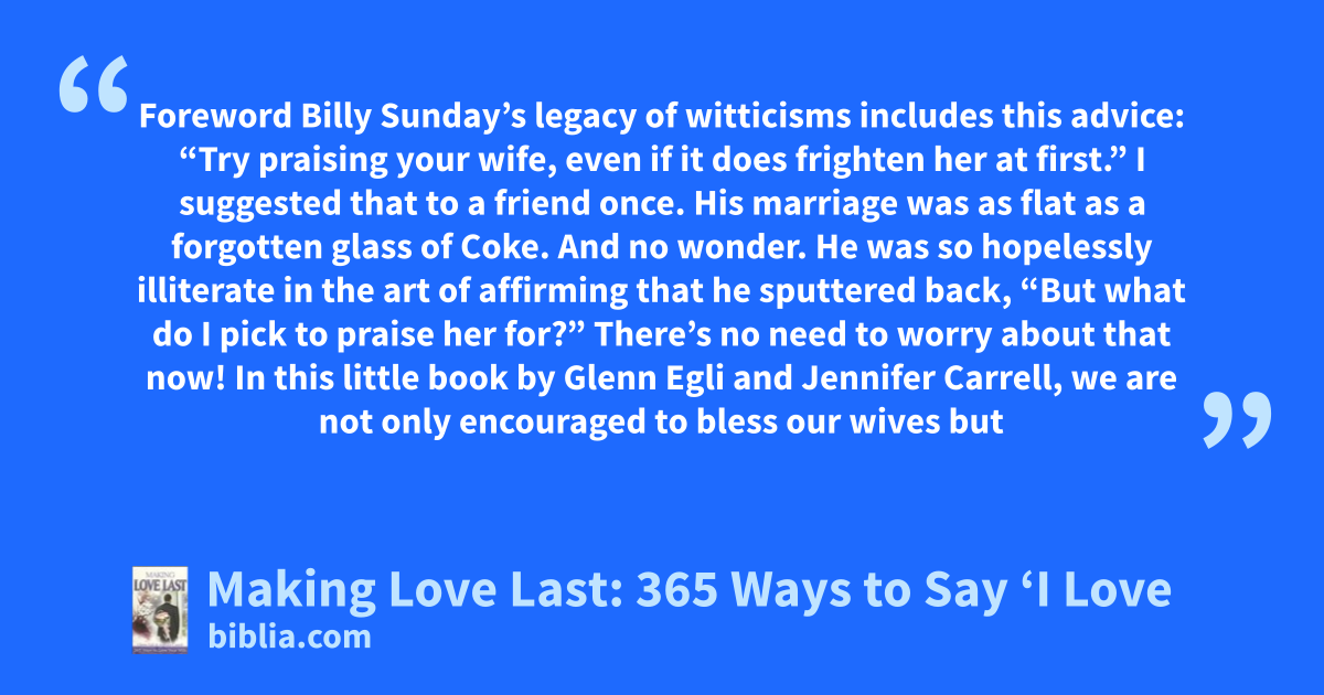Foreword Billy Sunday’s legacy of witticisms includes this advice: “Try praising your wife, even if it does frighten her at first.” I suggested that to a friend once. His marriage was as flat as a forgotten glass of Coke. And no wonder. He was so hopelessly illiterate in the art of affirming that he sputtered back, “But what do I pick to praise her for?” There’s no need to worry about that now! In this little book by Glenn Egli and Jennifer Carrell, we are not only encouraged to bless our wives but