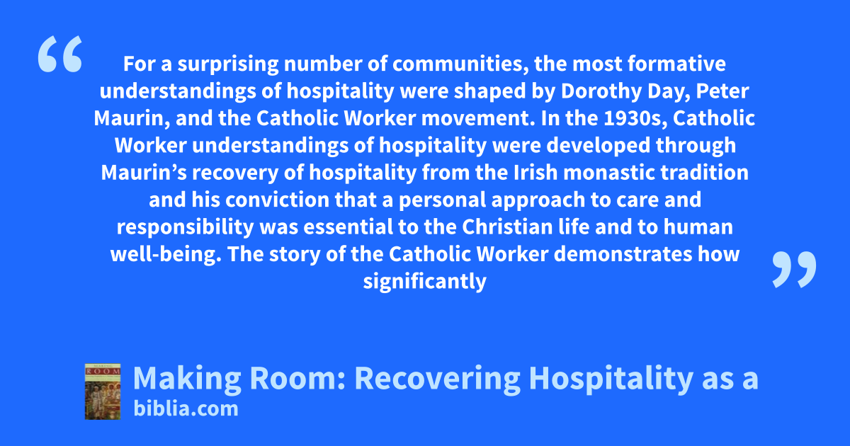 For a surprising number of communities, the most formative understandings of hospitality were shaped by Dorothy Day, Peter Maurin, and the Catholic Worker movement. In the 1930s, Catholic Worker understandings of hospitality were developed through Maurin’s recovery of hospitality from the Irish monastic tradition and his conviction that a personal approach to care and responsibility was essential to the Christian life and to human well-being. The story of the Catholic Worker demonstrates how significantly