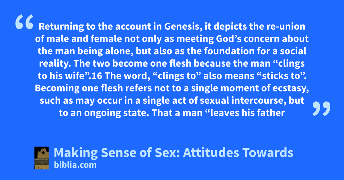 Returning to the account in Genesis, it depicts the re-union of male and female not only as meeting God’s concern about the man being alone, but also as the foundation for a social reality. The two become one flesh because the man “clings to his wife”.16 The word, “clings to” also means “sticks to”. Becoming one flesh refers not to a single moment of ecstasy, such as may occur in a single act of sexual intercourse, but to an ongoing state. That a man “leaves his father