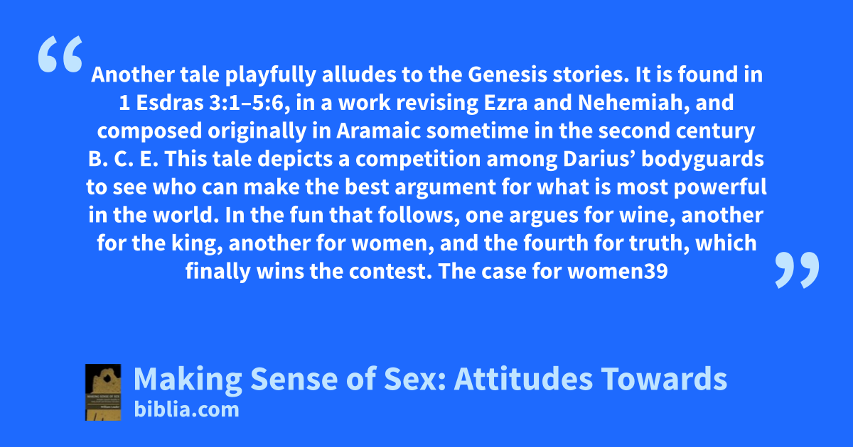 Another tale playfully alludes to the Genesis stories. It is found in 1 Esdras 3:1–5:6, in a work revising Ezra and Nehemiah, and composed originally in Aramaic sometime in the second century B. C. E. This tale depicts a competition among Darius’ bodyguards to see who can make the best argument for what is most powerful in the world. In the fun that follows, one argues for wine, another for the king, another for women, and the fourth for truth, which finally wins the contest. The case for women39