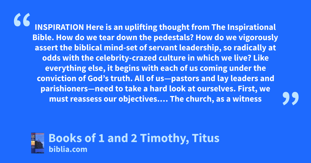 INSPIRATION Here is an uplifting thought from The Inspirational Bible. How do we tear down the pedestals? How do we vigorously assert the biblical mind-set of servant leadership, so radically at odds with the celebrity-crazed culture in which we live? Like everything else, it begins with each of us coming under the conviction of God’s truth. All of us—pastors and lay leaders and parishioners—need to take a hard look at ourselves. First, we must reassess our objectives.… The church, as a witness
