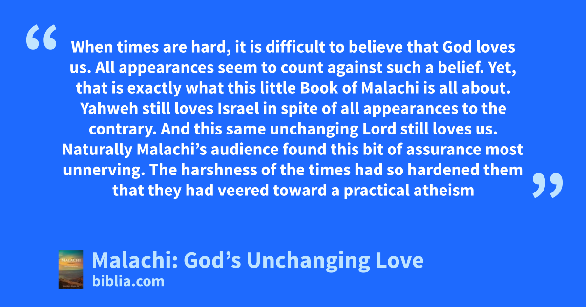 When times are hard, it is difficult to believe that God loves us. All appearances seem to count against such a belief. Yet, that is exactly what this little Book of Malachi is all about. Yahweh still loves Israel in spite of all appearances to the contrary. And this same unchanging Lord still loves us. Naturally Malachi’s audience found this bit of assurance most unnerving. The harshness of the times had so hardened them that they had veered toward a practical atheism