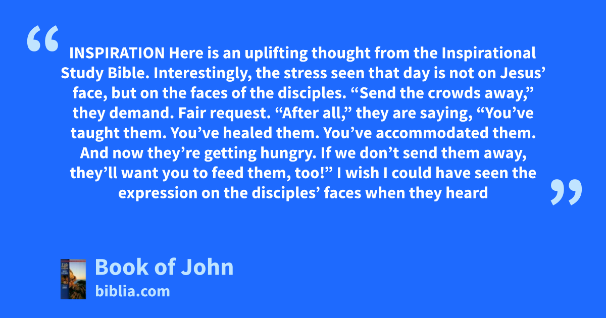 INSPIRATION Here is an uplifting thought from the Inspirational Study Bible. Interestingly, the stress seen that day is not on Jesus’ face, but on the faces of the disciples. “Send the crowds away,” they demand. Fair request. “After all,” they are saying, “You’ve taught them. You’ve healed them. You’ve accommodated them. And now they’re getting hungry. If we don’t send them away, they’ll want you to feed them, too!” I wish I could have seen the expression on the disciples’ faces when they heard