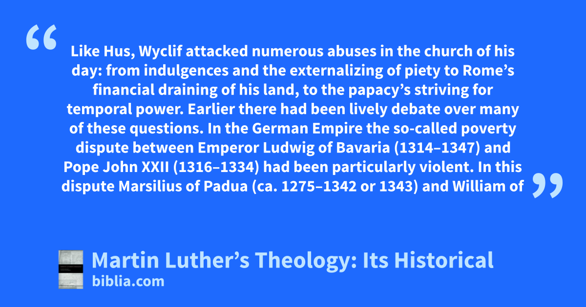 Like Hus, Wyclif attacked numerous abuses in the church of his day: from indulgences and the externalizing of piety to Rome’s financial draining of his land, to the papacy’s striving for temporal power. Earlier there had been lively debate over many of these questions. In the German Empire the so-called poverty dispute between Emperor Ludwig of Bavaria (1314–1347) and Pope John XXII (1316–1334) had been particularly violent. In this dispute Marsilius of Padua (ca. 1275–1342 or 1343) and William of
