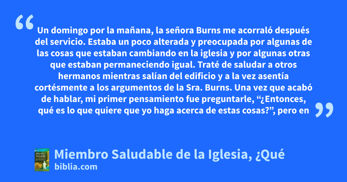 Un domingo por la mañana, la señora Burns me acorraló después del servicio. Estaba un poco alterada y preocupada por algunas de las cosas que estaban cambiando en la iglesia y por algunas otras que estaban permaneciendo igual. Traté de saludar a otros hermanos mientras salían del edificio y a la vez asentía cortésmente a los argumentos de la Sra. Burns. Una vez que acabó de hablar, mi primer pensamiento fue preguntarle, “¿Entonces, qué es lo que quiere que yo haga acerca de estas cosas?”, pero en