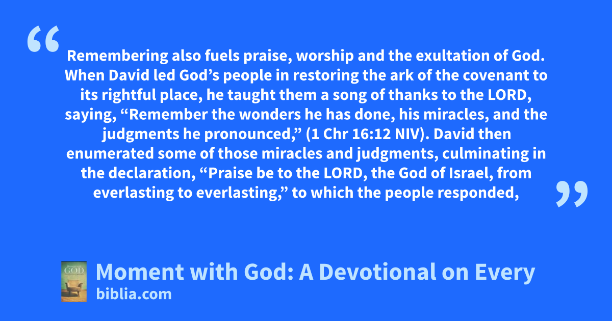 Remembering also fuels praise, worship and the exultation of God. When David led God’s people in restoring the ark of the covenant to its rightful place, he taught them a song of thanks to the Lord, saying, “Remember the wonders he has done, his miracles, and the judgments he pronounced,” (1 Chr 16:12 niv). David then enumerated some of those miracles and judgments, culminating in the declaration, “Praise be to the Lord, the God of Israel, from everlasting to everlasting,” to which the people responded, “Amen” and “Praise the Lord,” (1 Chr 16:36 niv).