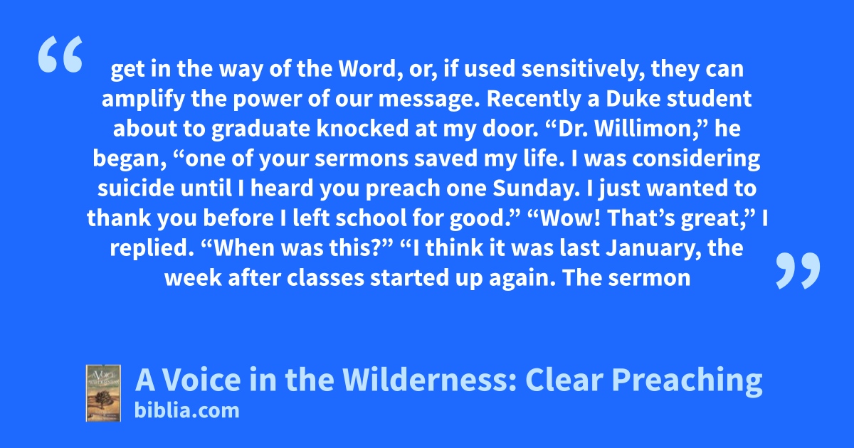 get in the way of the Word, or, if used sensitively, they can amplify the power of our message. Recently a Duke student about to graduate knocked at my door. “Dr. Willimon,” he began, “one of your sermons saved my life. I was considering suicide until I heard you preach one Sunday. I just wanted to thank you before I left school for good.” “Wow! That’s great,” I replied. “When was this?” “I think it was last January, the week after classes started up again. The sermon