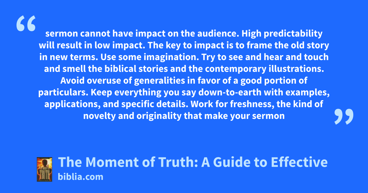 sermon cannot have impact on the audience. High predictability will result in low impact. The key to impact is to frame the old story in new terms. Use some imagination. Try to see and hear and touch and smell the biblical stories and the contemporary illustrations. Avoid overuse of generalities in favor of a good portion of particulars. Keep everything you say down-to-earth with examples, applications, and specific details. Work for freshness, the kind of novelty and originality that make your sermon