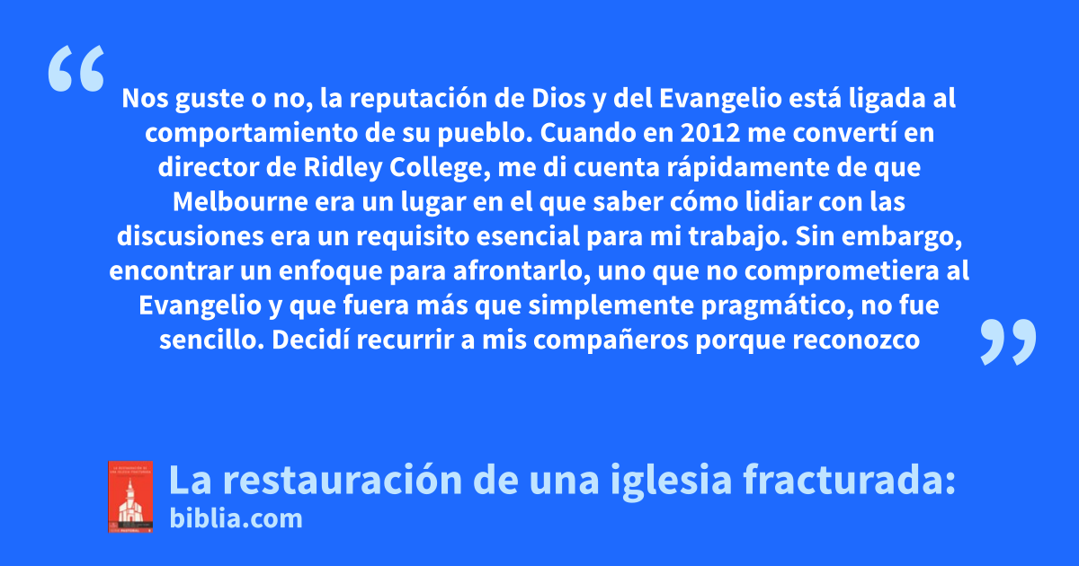 Nos guste o no, la reputación de Dios y del Evangelio está ligada al comportamiento de su pueblo. Cuando en 2012 me convertí en director de Ridley College, me di cuenta rápidamente de que Melbourne era un lugar en el que saber cómo lidiar con las discusiones era un requisito esencial para mi trabajo. Sin embargo, encontrar un enfoque para afrontarlo, uno que no comprometiera al Evangelio y que fuera más que simplemente pragmático, no fue sencillo. Decidí recurrir a mis compañeros porque reconozco