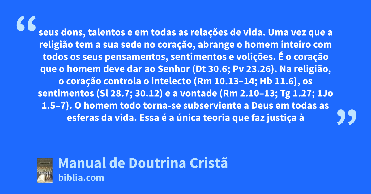 seus dons, talentos e em todas as relações de vida. Uma vez que a religião tem a sua sede no coração, abrange o homem inteiro com todos os seus pensamentos, sentimentos e volições. É o coração que o homem deve dar ao Senhor (Dt 30.6; Pv 23.26). Na religião, o coração controla o intelecto (Rm 10.13–14; Hb 11.6), os sentimentos (Sl 28.7; 30.12) e a vontade (Rm 2.10–13; Tg 1.27; 1Jo 1.5–7). O homem todo torna-se subserviente a Deus em todas as esferas da vida. Essa é a única teoria que faz justiça à