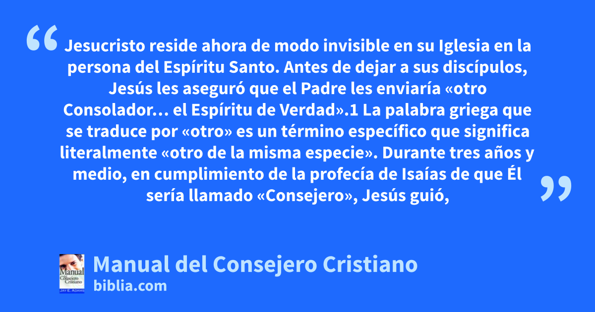 Jesucristo reside ahora de modo invisible en su Iglesia en la persona del Espíritu Santo. Antes de dejar a sus discípulos, Jesús les aseguró que el Padre les enviaría «otro Consolador… el Espíritu de Verdad».1 La palabra griega que se traduce por «otro» es un término específico que significa literalmente «otro de la misma especie». Durante tres años y medio, en cumplimiento de la profecía de Isaías de que Él sería llamado «Consejero», Jesús guió,