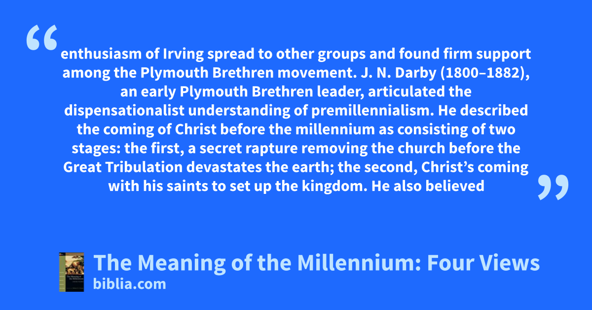 enthusiasm of Irving spread to other groups and found firm support among the Plymouth Brethren movement. J. N. Darby (1800–1882), an early Plymouth Brethren leader, articulated the dispensationalist understanding of premillennialism. He described the coming of Christ before the millennium as consisting of two stages: the first, a secret rapture removing the church before the Great Tribulation devastates the earth; the second, Christ’s coming with his saints to set up the kingdom. He also believed
