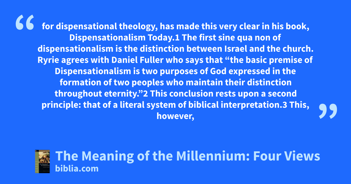 for dispensational theology, has made this very clear in his book, Dispensationalism Today.1 The first sine qua non of dispensationalism is the distinction between Israel and the church. Ryrie agrees with Daniel Fuller who says that “the basic premise of Dispensationalism is two purposes of God expressed in the formation of two peoples who maintain their distinction throughout eternity.”2 This conclusion rests upon a second principle: that of a literal system of biblical interpretation.3 This, however,