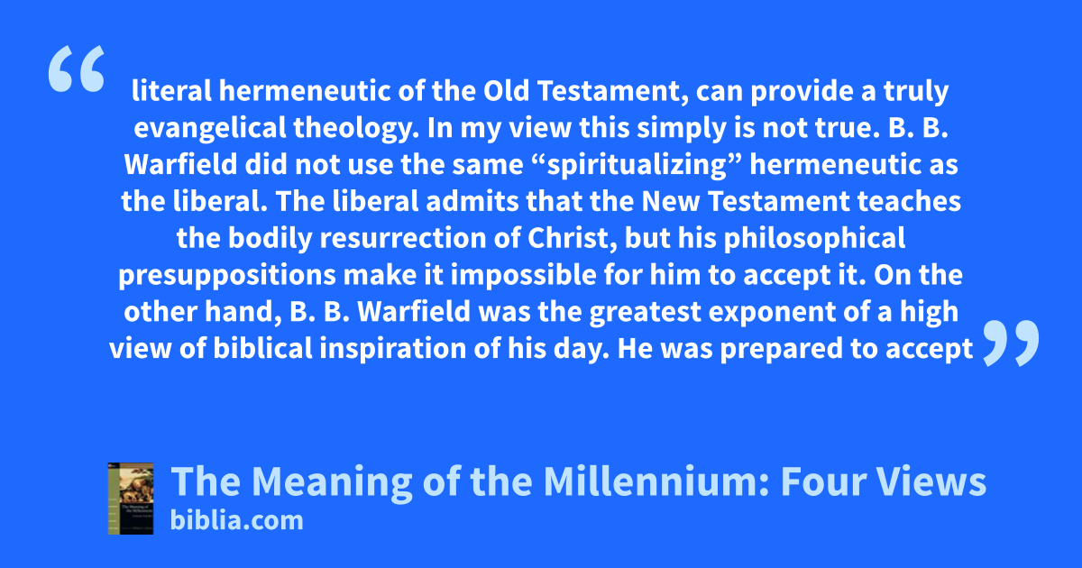literal hermeneutic of the Old Testament, can provide a truly evangelical theology. In my view this simply is not true. B. B. Warfield did not use the same “spiritualizing” hermeneutic as the liberal. The liberal admits that the New Testament teaches the bodily resurrection of Christ, but his philosophical presuppositions make it impossible for him to accept it. On the other hand, B. B. Warfield was the greatest exponent of a high view of biblical inspiration of his day. He was prepared to accept
