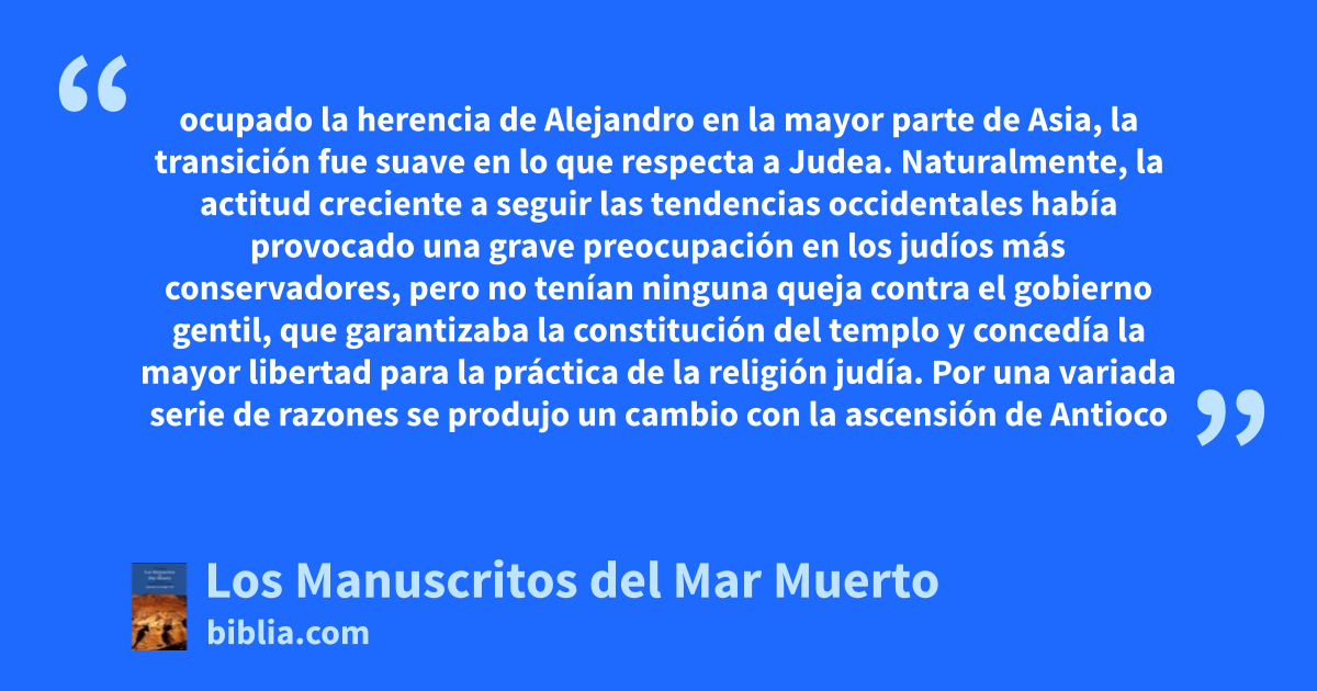 ocupado la herencia de Alejandro en la mayor parte de Asia, la transición fue suave en lo que respecta a Judea. Naturalmente, la actitud creciente a seguir las tendencias occidentales había provocado una grave preocupación en los judíos más conservadores, pero no tenían ninguna queja contra el gobierno gentil, que garantizaba la constitución del templo y concedía la mayor libertad para la práctica de la religión judía. Por una variada serie de razones se produjo un cambio con la ascensión de Antioco