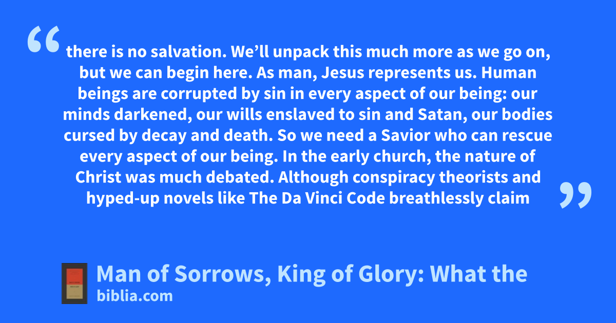 there is no salvation. We’ll unpack this much more as we go on, but we can begin here. As man, Jesus represents us. Human beings are corrupted by sin in every aspect of our being: our minds darkened, our wills enslaved to sin and Satan, our bodies cursed by decay and death. So we need a Savior who can rescue every aspect of our being. In the early church, the nature of Christ was much debated. Although conspiracy theorists and hyped-up novels like The Da Vinci Code breathlessly claim