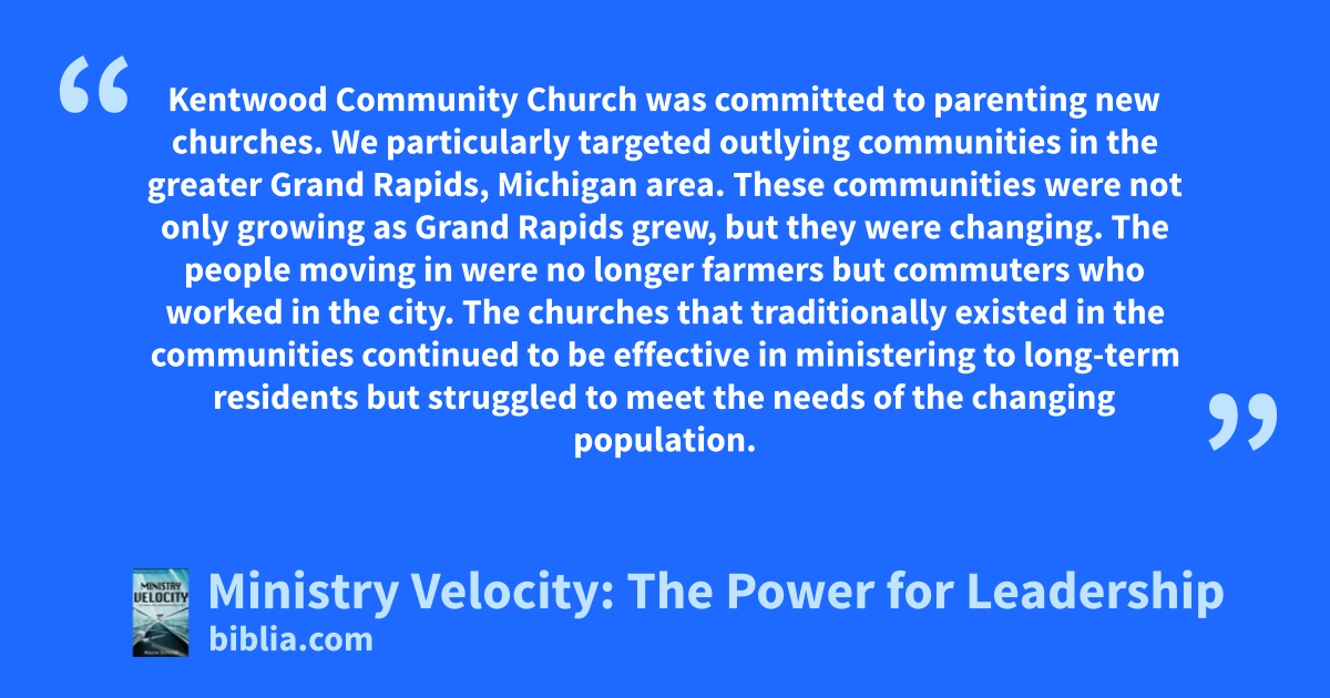 Kentwood Community Church was committed to parenting new churches. We particularly targeted outlying communities in the greater Grand Rapids, Michigan area. These communities were not only growing as Grand Rapids grew, but they were changing. The people moving in were no longer farmers but commuters who worked in the city. The churches that traditionally existed in the communities continued to be effective in ministering to long-term residents but struggled to meet the needs of the changing population.
