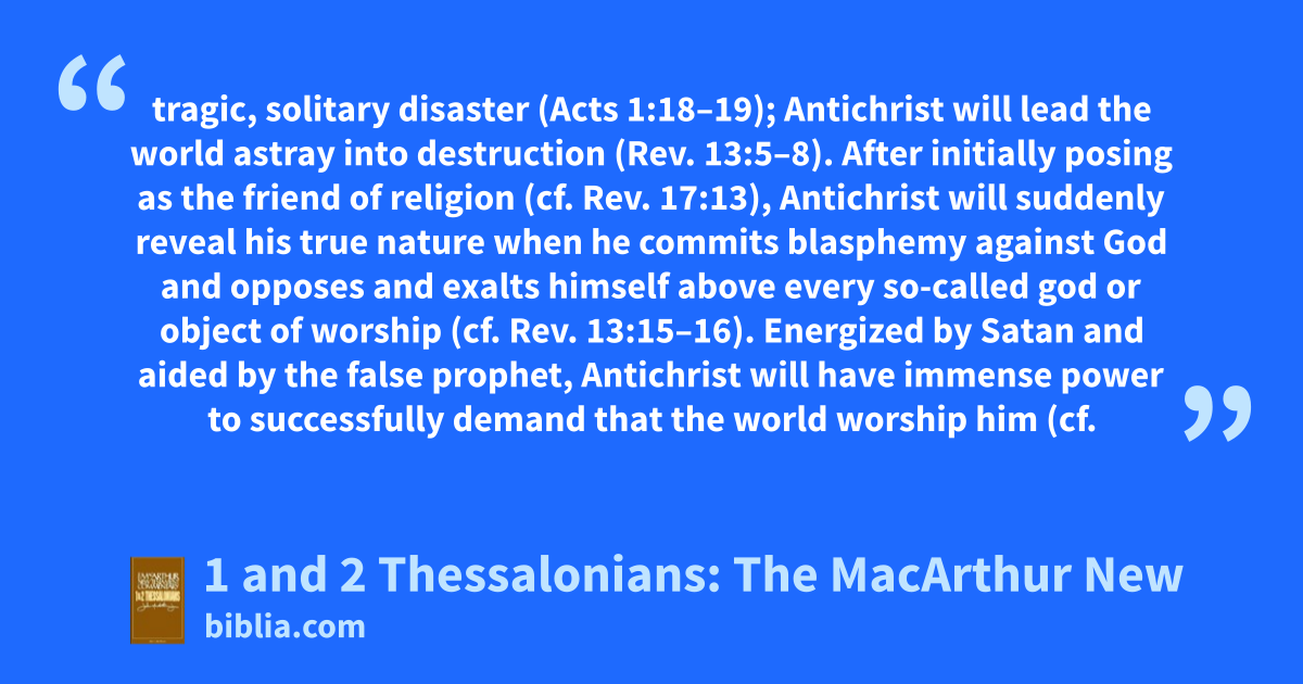 tragic, solitary disaster (Acts 1:18–19); Antichrist will lead the world astray into destruction (Rev. 13:5–8). After initially posing as the friend of religion (cf. Rev. 17:13), Antichrist will suddenly reveal his true nature when he commits blasphemy against God and opposes and exalts himself above every so-called god or object of worship (cf. Rev. 13:15–16). Energized by Satan and aided by the false prophet, Antichrist will have immense power to successfully demand that the world worship him (cf.