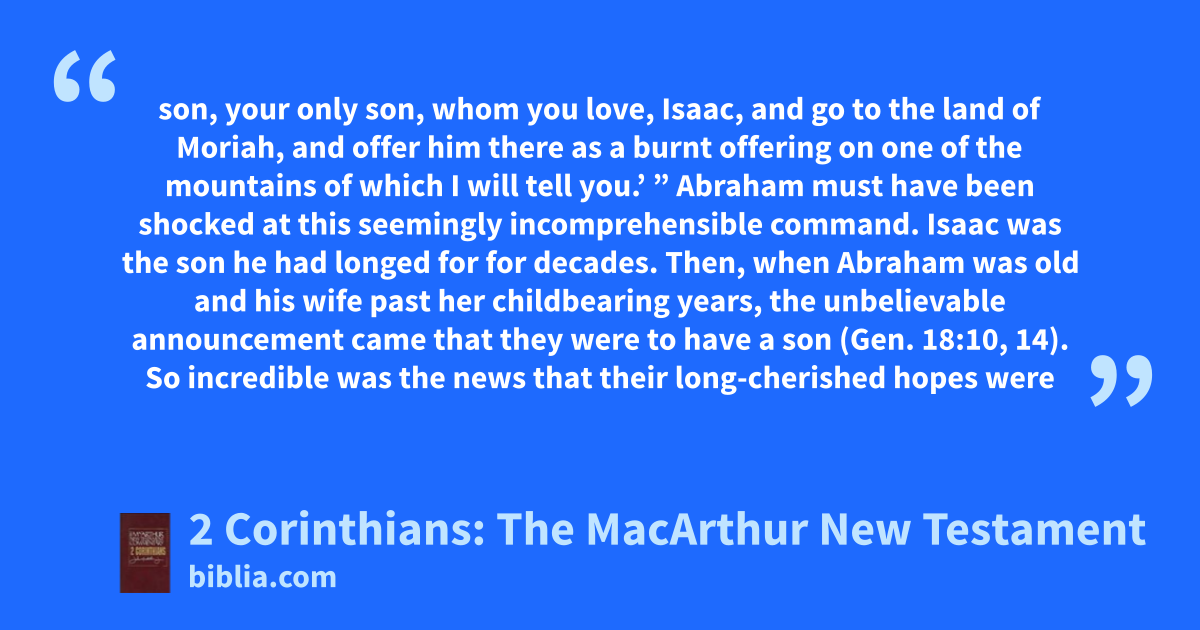 son, your only son, whom you love, Isaac, and go to the land of Moriah, and offer him there as a burnt offering on one of the mountains of which I will tell you.’ ” Abraham must have been shocked at this seemingly incomprehensible command. Isaac was the son he had longed for for decades. Then, when Abraham was old and his wife past her childbearing years, the unbelievable announcement came that they were to have a son (Gen. 18:10, 14). So incredible was the news that their long-cherished hopes were