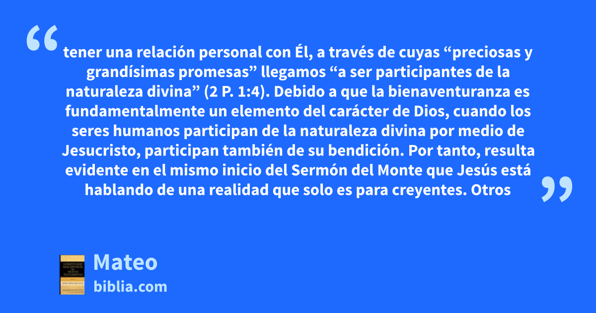 tener una relación personal con Él, a través de cuyas “preciosas y grandísimas promesas” llegamos “a ser participantes de la naturaleza divina” (2 P. 1:4). Debido a que la bienaventuranza es fundamentalmente un elemento del carácter de Dios, cuando los seres humanos participan de la naturaleza divina por medio de Jesucristo, participan también de su bendición. Por tanto, resulta evidente en el mismo inicio del Sermón del Monte que Jesús está hablando de una realidad que solo es para creyentes. Otros