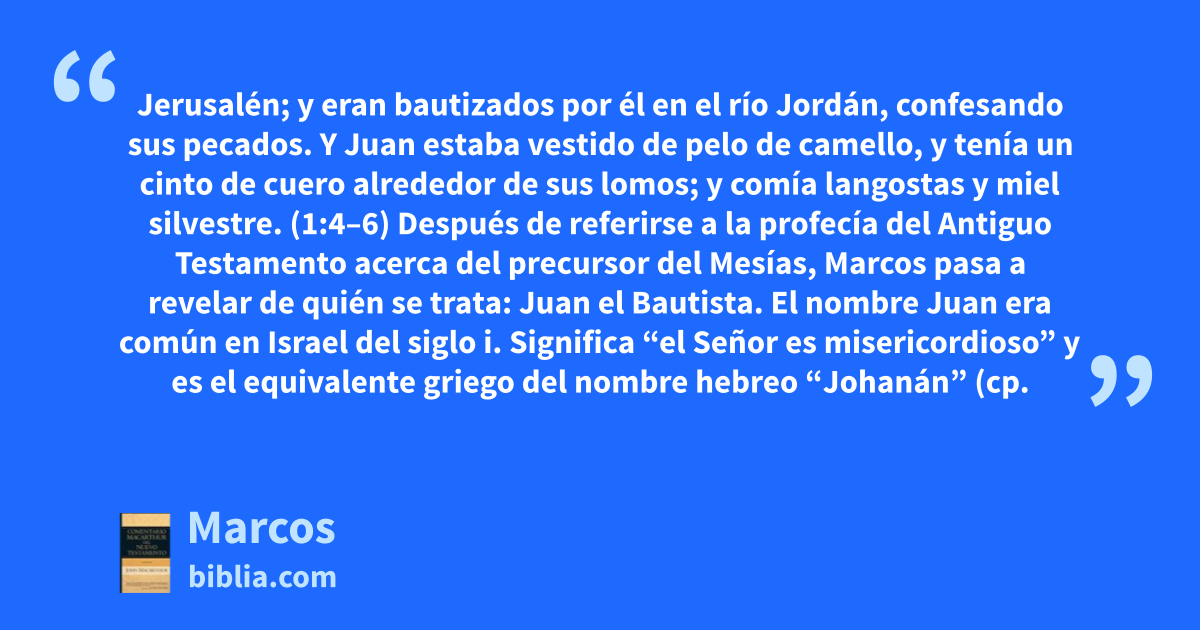 Jerusalén; y eran bautizados por él en el río Jordán, confesando sus pecados. Y Juan estaba vestido de pelo de camello, y tenía un cinto de cuero alrededor de sus lomos; y comía langostas y miel silvestre. (1:4–6) Después de referirse a la profecía del Antiguo Testamento acerca del precursor del Mesías, Marcos pasa a revelar de quién se trata: Juan el Bautista. El nombre Juan era común en Israel del siglo i. Significa “el Señor es misericordioso” y es el equivalente griego del nombre hebreo “Johanán” (cp.