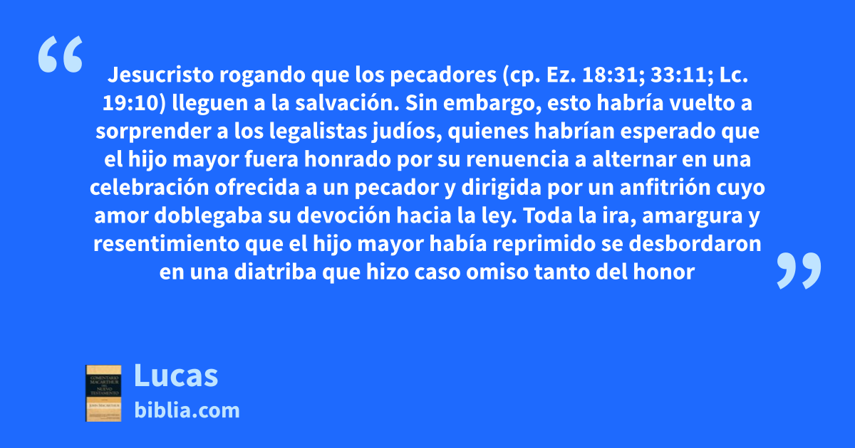 Jesucristo rogando que los pecadores (cp. Ez. 18:31; 33:11; Lc. 19:10) lleguen a la salvación. Sin embargo, esto habría vuelto a sorprender a los legalistas judíos, quienes habrían esperado que el hijo mayor fuera honrado por su renuencia a alternar en una celebración ofrecida a un pecador y dirigida por un anfitrión cuyo amor doblegaba su devoción hacia la ley. Toda la ira, amargura y resentimiento que el hijo mayor había reprimido se desbordaron en una diatriba que hizo caso omiso tanto del honor