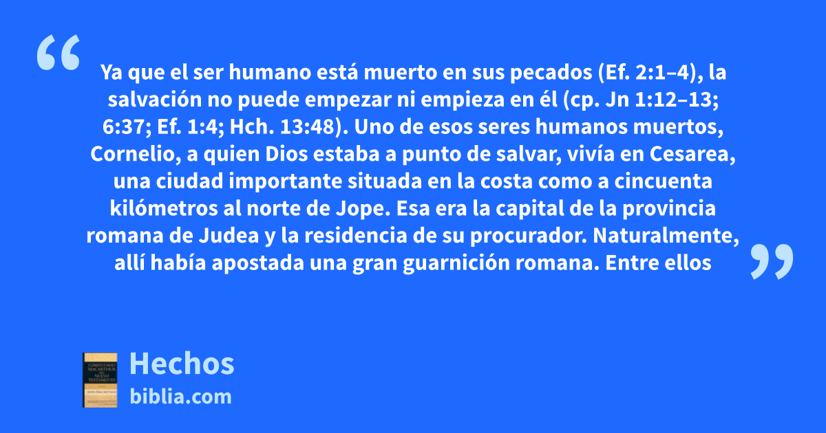 Ya que el ser humano está muerto en sus pecados (Ef. 2:1–4), la salvación no puede empezar ni empieza en él (cp. Jn 1:12–13; 6:37; Ef. 1:4; Hch. 13:48). Uno de esos seres humanos muertos, Cornelio, a quien Dios estaba a punto de salvar, vivía en Cesarea, una ciudad importante situada en la costa como a cincuenta kilómetros al norte de Jope. Esa era la capital de la provincia romana de Judea y la residencia de su procurador. Naturalmente, allí había apostada una gran guarnición romana. Entre ellos