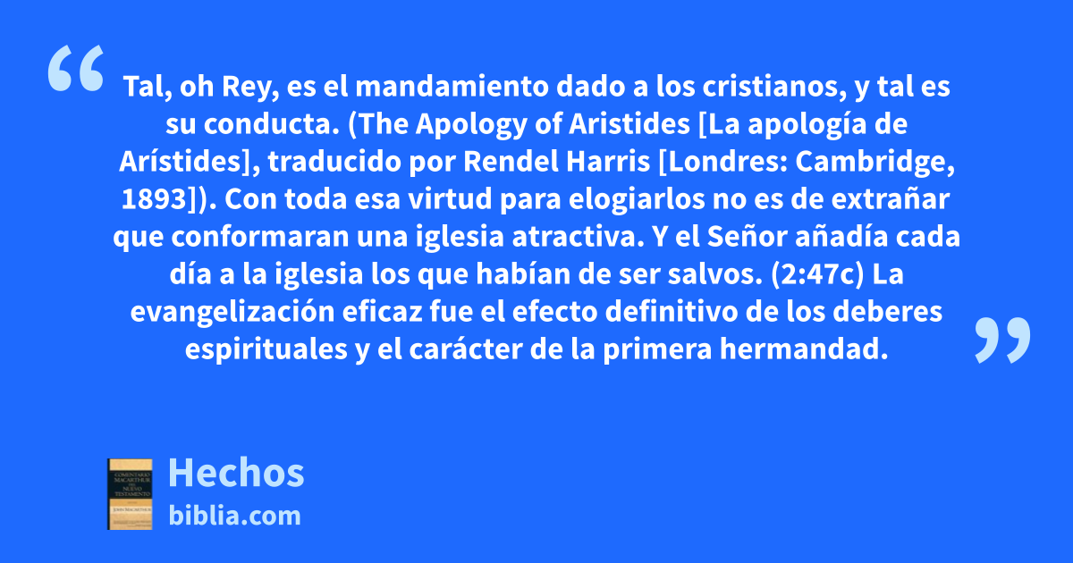 Tal, oh Rey, es el mandamiento dado a los cristianos, y tal es su conducta. (The Apology of Aristides [La apología de Arístides], traducido por Rendel Harris [Londres: Cambridge, 1893]). Con toda esa virtud para elogiarlos no es de extrañar que conformaran una iglesia atractiva. Y el Señor añadía cada día a la iglesia los que habían de ser salvos. (2:47c) La evangelización eficaz fue el efecto definitivo de los deberes espirituales y el carácter de la primera hermandad.