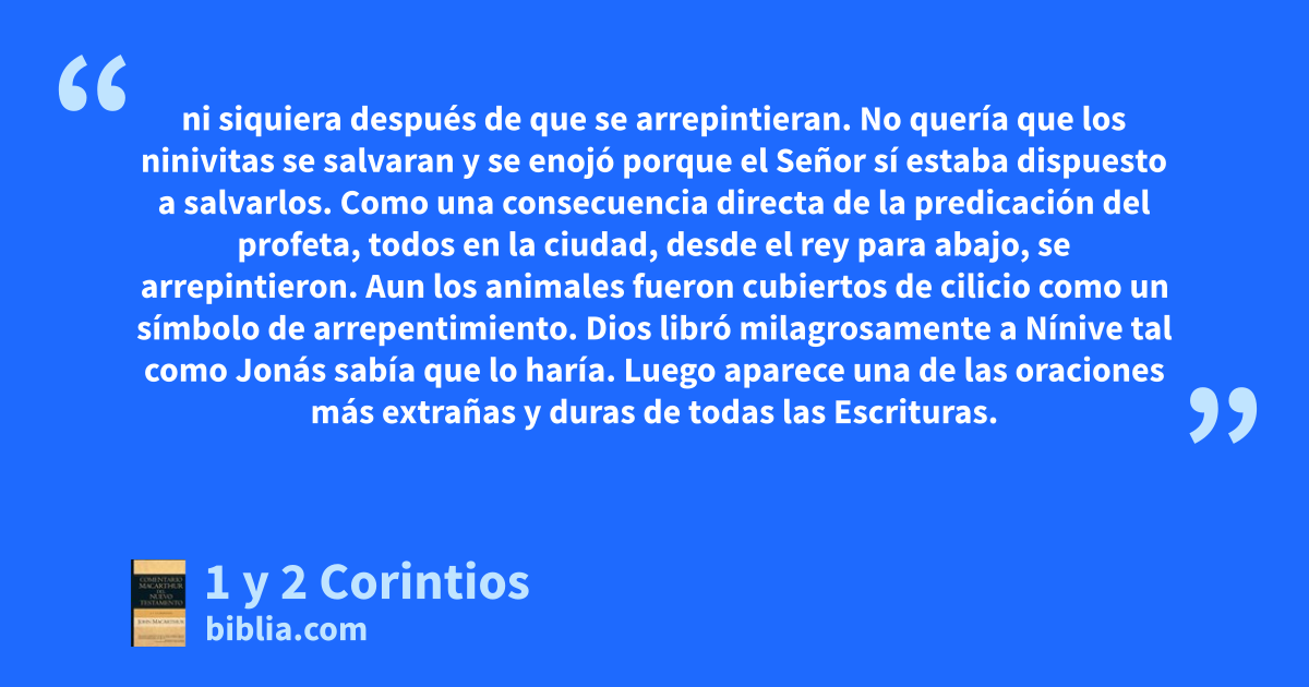 ni siquiera después de que se arrepintieran. No quería que los ninivitas se salvaran y se enojó porque el Señor sí estaba dispuesto a salvarlos. Como una consecuencia directa de la predicación del profeta, todos en la ciudad, desde el rey para abajo, se arrepintieron. Aun los animales fueron cubiertos de cilicio como un símbolo de arrepentimiento. Dios libró milagrosamente a Nínive tal como Jonás sabía que lo haría. Luego aparece una de las oraciones más extrañas y duras de todas las Escrituras.