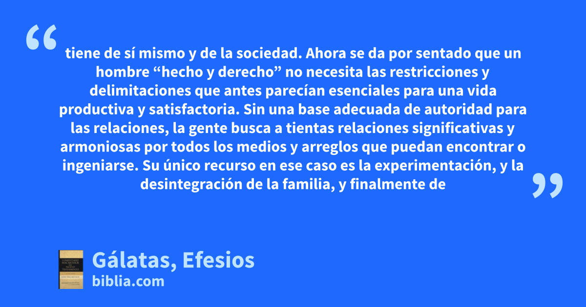 tiene de sí mismo y de la sociedad. Ahora se da por sentado que un hombre “hecho y derecho” no necesita las restricciones y delimitaciones que antes parecían esenciales para una vida productiva y satisfactoria. Sin una base adecuada de autoridad para las relaciones, la gente busca a tientas relaciones significativas y armoniosas por todos los medios y arreglos que puedan encontrar o ingeniarse. Su único recurso en ese caso es la experimentación, y la desintegración de la familia, y finalmente de