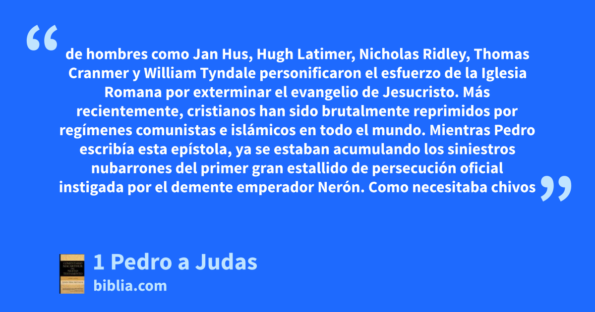 de hombres como Jan Hus, Hugh Latimer, Nicholas Ridley, Thomas Cranmer y William Tyndale personificaron el esfuerzo de la Iglesia Romana por exterminar el evangelio de Jesucristo. Más recientemente, cristianos han sido brutalmente reprimidos por regímenes comunistas e islámicos en todo el mundo. Mientras Pedro escribía esta epístola, ya se estaban acumulando los siniestros nubarrones del primer gran estallido de persecución oficial instigada por el demente emperador Nerón. Como necesitaba chivos