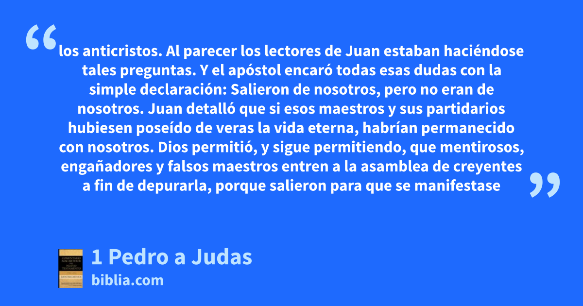 los anticristos. Al parecer los lectores de Juan estaban haciéndose tales preguntas. Y el apóstol encaró todas esas dudas con la simple declaración: Salieron de nosotros, pero no eran de nosotros. Juan detalló que si esos maestros y sus partidarios hubiesen poseído de veras la vida eterna, habrían permanecido con nosotros. Dios permitió, y sigue permitiendo, que mentirosos, engañadores y falsos maestros entren a la asamblea de creyentes a fin de depurarla, porque salieron para que se manifestase