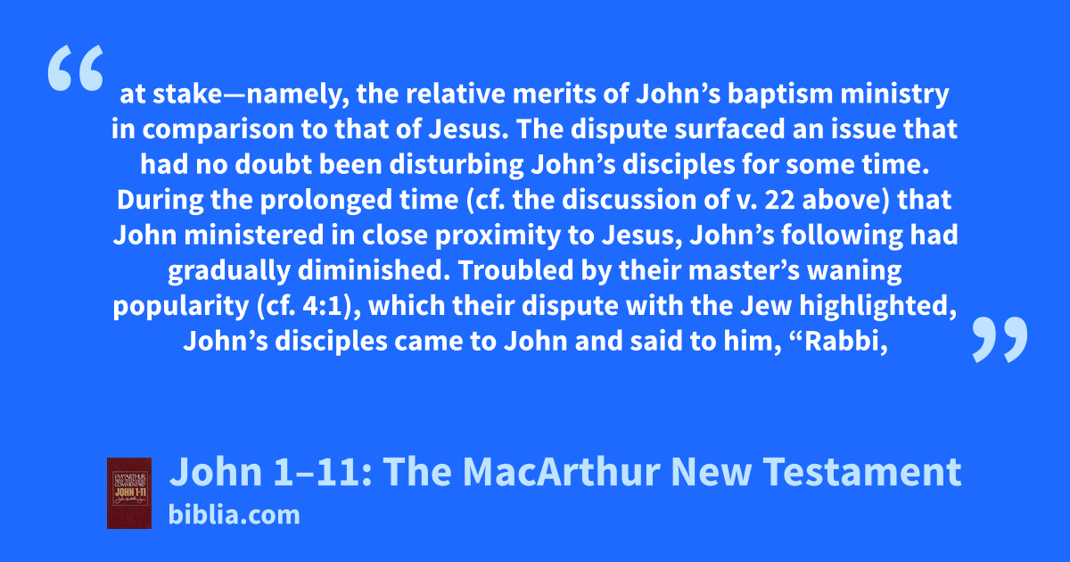 at stake—namely, the relative merits of John’s baptism ministry in comparison to that of Jesus. The dispute surfaced an issue that had no doubt been disturbing John’s disciples for some time. During the prolonged time (cf. the discussion of v. 22 above) that John ministered in close proximity to Jesus, John’s following had gradually diminished. Troubled by their master’s waning popularity (cf. 4:1), which their dispute with the Jew highlighted, John’s disciples came to John and said to him, “Rabbi,