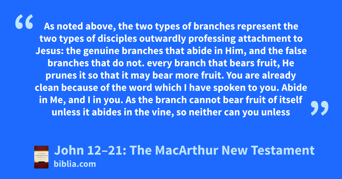 As noted above, the two types of branches represent the two types of disciples outwardly professing attachment to Jesus: the genuine branches that abide in Him, and the false branches that do not. every branch that bears fruit, He prunes it so that it may bear more fruit. You are already clean because of the word which I have spoken to you. Abide in Me, and I in you. As the branch cannot bear fruit of itself unless it abides in the vine, so neither can you unless