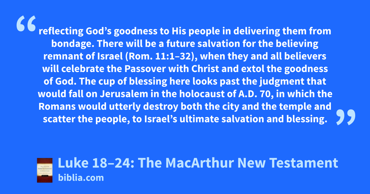 reflecting God’s goodness to His people in delivering them from bondage. There will be a future salvation for the believing remnant of Israel (Rom. 11:1–32), when they and all believers will celebrate the Passover with Christ and extol the goodness of God. The cup of blessing here looks past the judgment that would fall on Jerusalem in the holocaust of A.D. 70, in which the Romans would utterly destroy both the city and the temple and scatter the people, to Israel’s ultimate salvation and blessing.