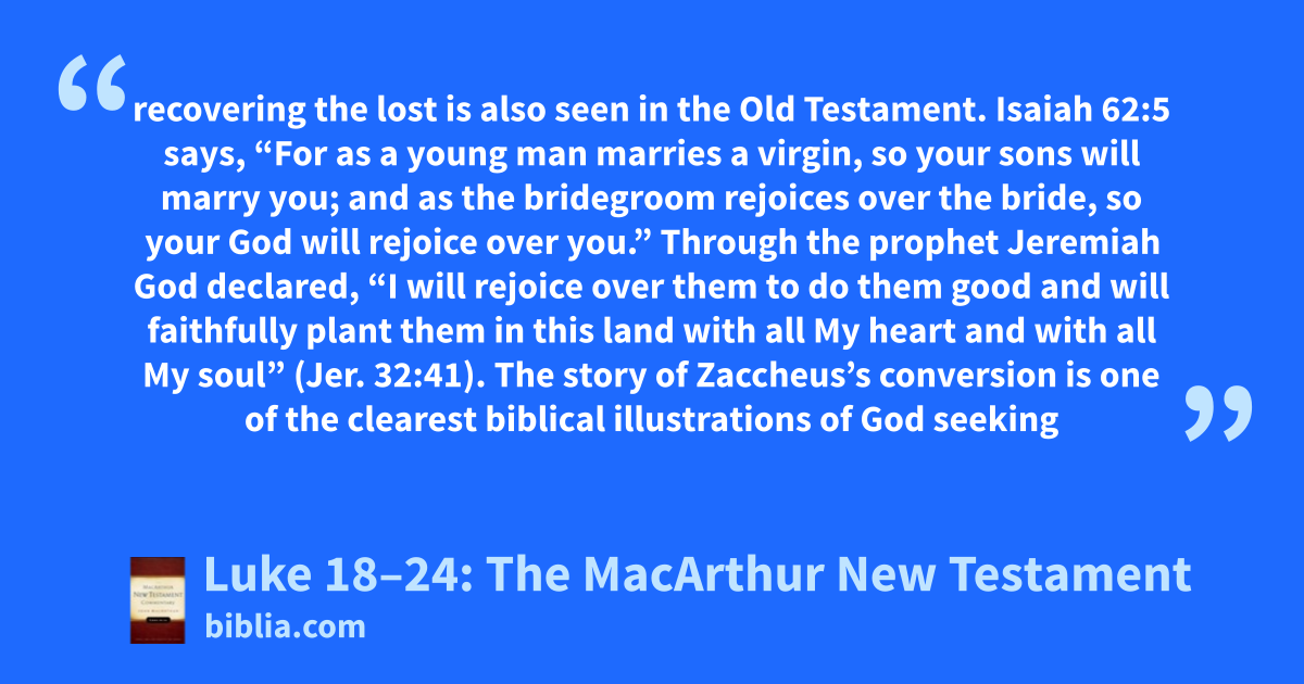 recovering the lost is also seen in the Old Testament. Isaiah 62:5 says, “For as a young man marries a virgin, so your sons will marry you; and as the bridegroom rejoices over the bride, so your God will rejoice over you.” Through the prophet Jeremiah God declared, “I will rejoice over them to do them good and will faithfully plant them in this land with all My heart and with all My soul” (Jer. 32:41). The story of Zaccheus’s conversion is one of the clearest biblical illustrations of God seeking