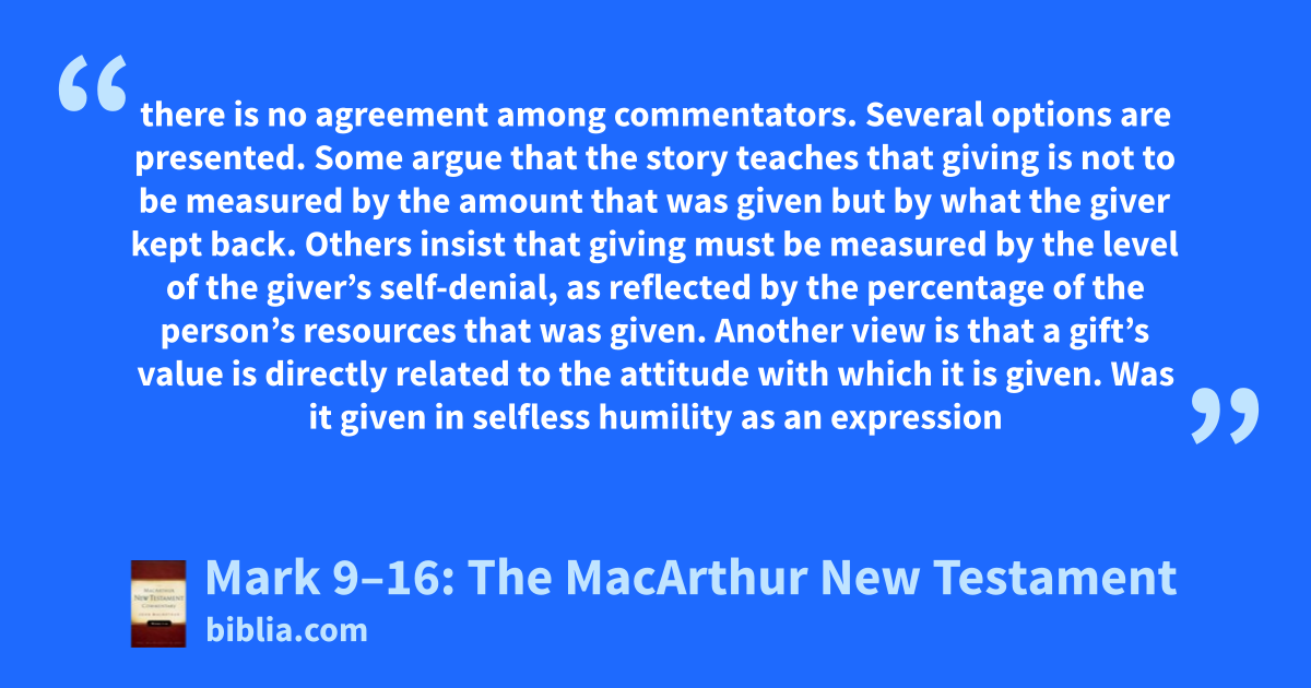 there is no agreement among commentators. Several options are presented. Some argue that the story teaches that giving is not to be measured by the amount that was given but by what the giver kept back. Others insist that giving must be measured by the level of the giver’s self-denial, as reflected by the percentage of the person’s resources that was given. Another view is that a gift’s value is directly related to the attitude with which it is given. Was it given in selfless humility as an expression