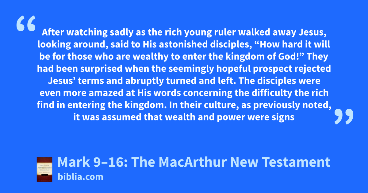 After watching sadly as the rich young ruler walked away Jesus, looking around, said to His astonished disciples, “How hard it will be for those who are wealthy to enter the kingdom of God!” They had been surprised when the seemingly hopeful prospect rejected Jesus’ terms and abruptly turned and left. The disciples were even more amazed at His words concerning the difficulty the rich find in entering the kingdom. In their culture, as previously noted, it was assumed that wealth and power were signs