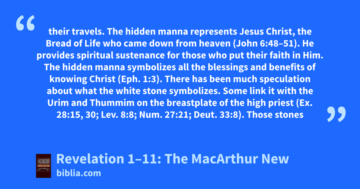 their travels. The hidden manna represents Jesus Christ, the Bread of Life who came down from heaven (John 6:48–51). He provides spiritual sustenance for those who put their faith in Him. The hidden manna symbolizes all the blessings and benefits of knowing Christ (Eph. 1:3). There has been much speculation about what the white stone symbolizes. Some link it with the Urim and Thummim on the breastplate of the high priest (Ex. 28:15, 30; Lev. 8:8; Num. 27:21; Deut. 33:8). Those stones