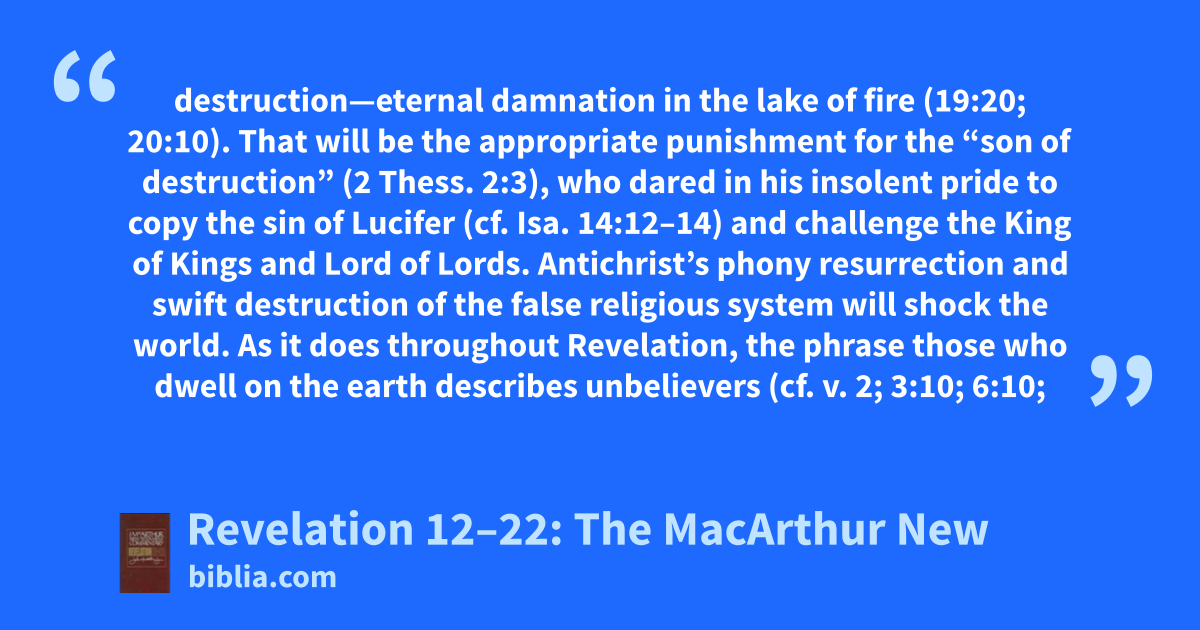 destruction—eternal damnation in the lake of fire (19:20; 20:10). That will be the appropriate punishment for the “son of destruction” (2 Thess. 2:3), who dared in his insolent pride to copy the sin of Lucifer (cf. Isa. 14:12–14) and challenge the King of Kings and Lord of Lords. Antichrist’s phony resurrection and swift destruction of the false religious system will shock the world. As it does throughout Revelation, the phrase those who dwell on the earth describes unbelievers (cf. v. 2; 3:10; 6:10;