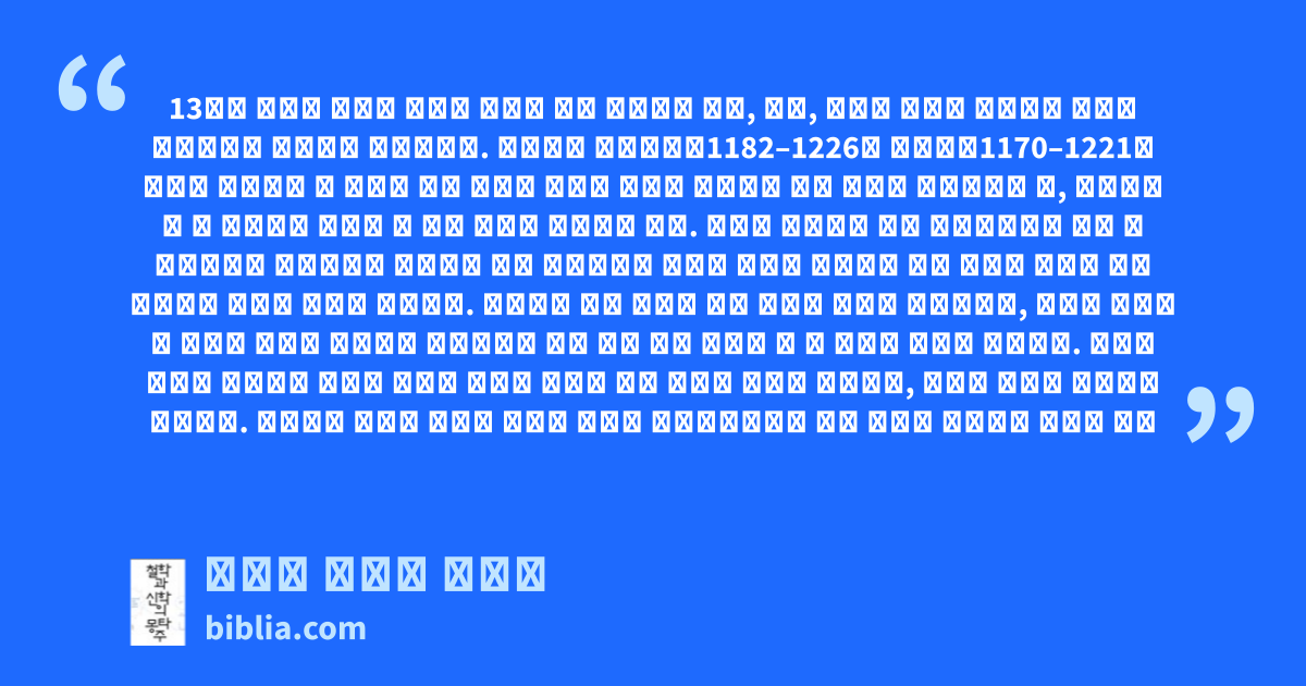 13세기 수도원 운동의 중흥은 이들의 본래 정신이던 청빈, 금욕, 순종의 덕목을 회복하고 성실히 수행하려는 염원에서 비롯되었다. 아시시의 프란체스코1182–1226와 도미니크1170–1221를 기수로 재점화된 이 중흥은 기존 수도원 운동의 축이던 베네딕트 파와 더불어 프란체스코 파, 도미니크 파 등 설립자의 이름을 딴 주류 종파로 자리하게 된다. 이들은 한결같이 예수 그리스도께서 보여 준 실천덕목을 중심과제로 삼았기에 설립 취지에서는 차이가 없지만 설립자들 사후 하나의 조직이 되어 가면서는 노선에 차이가 나타났다. 도미니크 파는 실천과 행함 외에도 학문을 강조했는데, 신앙의 뼈대가 될 교리가 바르고 명확하게 세워져야만 설교 역시 바른 설교가 될 수 있다고 믿었기 때문이다. 그래서 그들의 수도사는 이러한 훈련의 결과로 뛰어난 지적 능력을 갖추게 되었으며, 갖가지 학문적 성과까지 이루었다. 그러면서 이들이 지녔던 빈곤의 덕목은 필연적이면서도 주된 실천의 단계에서 물러나 단지
