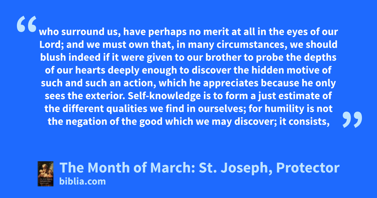who surround us, have perhaps no merit at all in the eyes of our Lord; and we must own that, in many circumstances, we should blush indeed if it were given to our brother to probe the depths of our hearts deeply enough to discover the hidden motive of such and such an action, which he appreciates because he only sees the exterior. Self-knowledge is to form a just estimate of the different qualities we find in ourselves; for humility is not the negation of the good which we may discover; it consists,