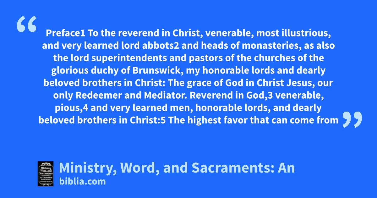 Preface1 To the reverend in Christ, venerable, most illustrious, and very learned lord abbots2 and heads of monasteries, as also the lord superintendents and pastors of the churches of the glorious duchy of Brunswick, my honorable lords and dearly beloved brothers in Christ: The grace of God in Christ Jesus, our only Redeemer and Mediator. Reverend in God,3 venerable, pious,4 and very learned men, honorable lords, and dearly beloved brothers in Christ:5 The highest favor that can come from